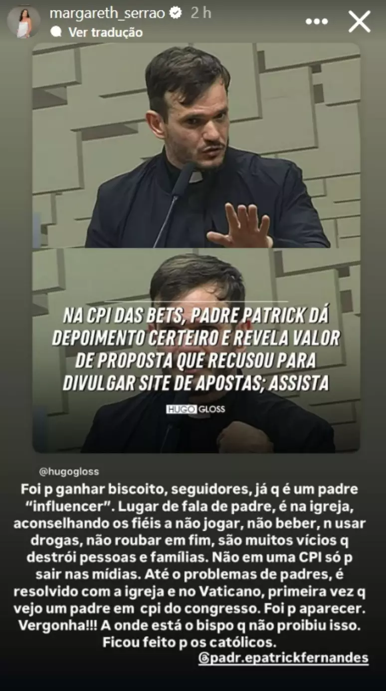 As declarações incomodaram Margareth Serrão, que reagiu nas redes sociais. Em tom ácido, sugeriu que o padre estaria se aproveitando da CPI para ganhar visibilidade. “Mas agora até padre, atrás de biscoito, de seguidores, de ganhar engajamento, está inseminando ódio. É o fim dos tempos mesmo!”, escreveu ela.