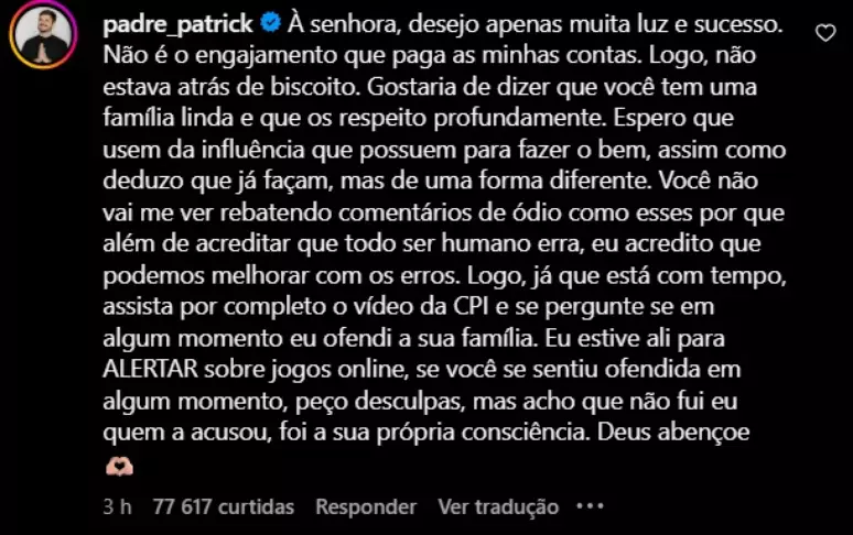A resposta do padre veio horas depois. “À senhora, desejo apenas muita luz e sucesso. Não é engajamento que paga minhas contas”, afirmou. “Espero que usem da influência que possuem para fazer o bem, assim como deduzo que já façam, mas de uma forma diferente.”